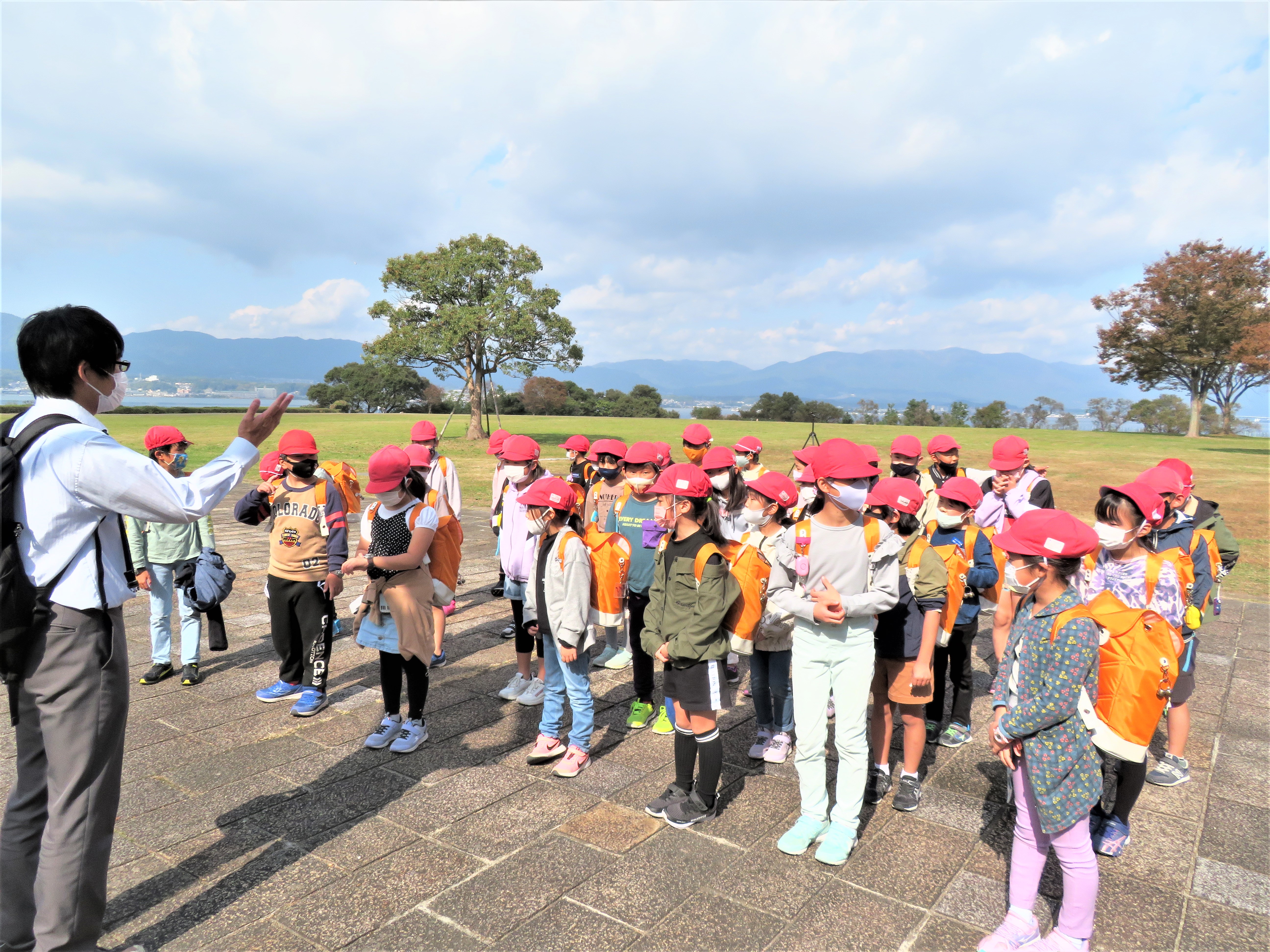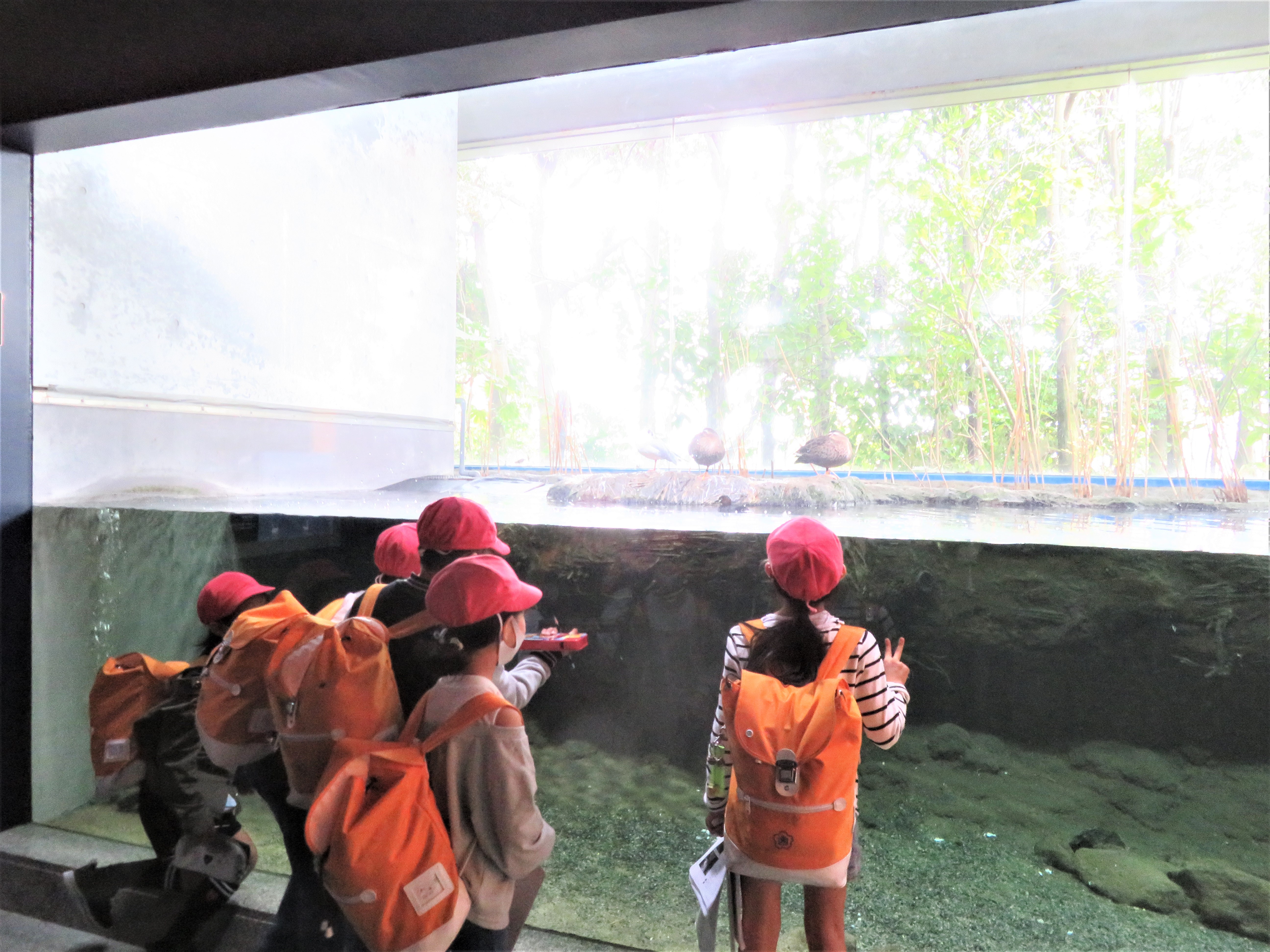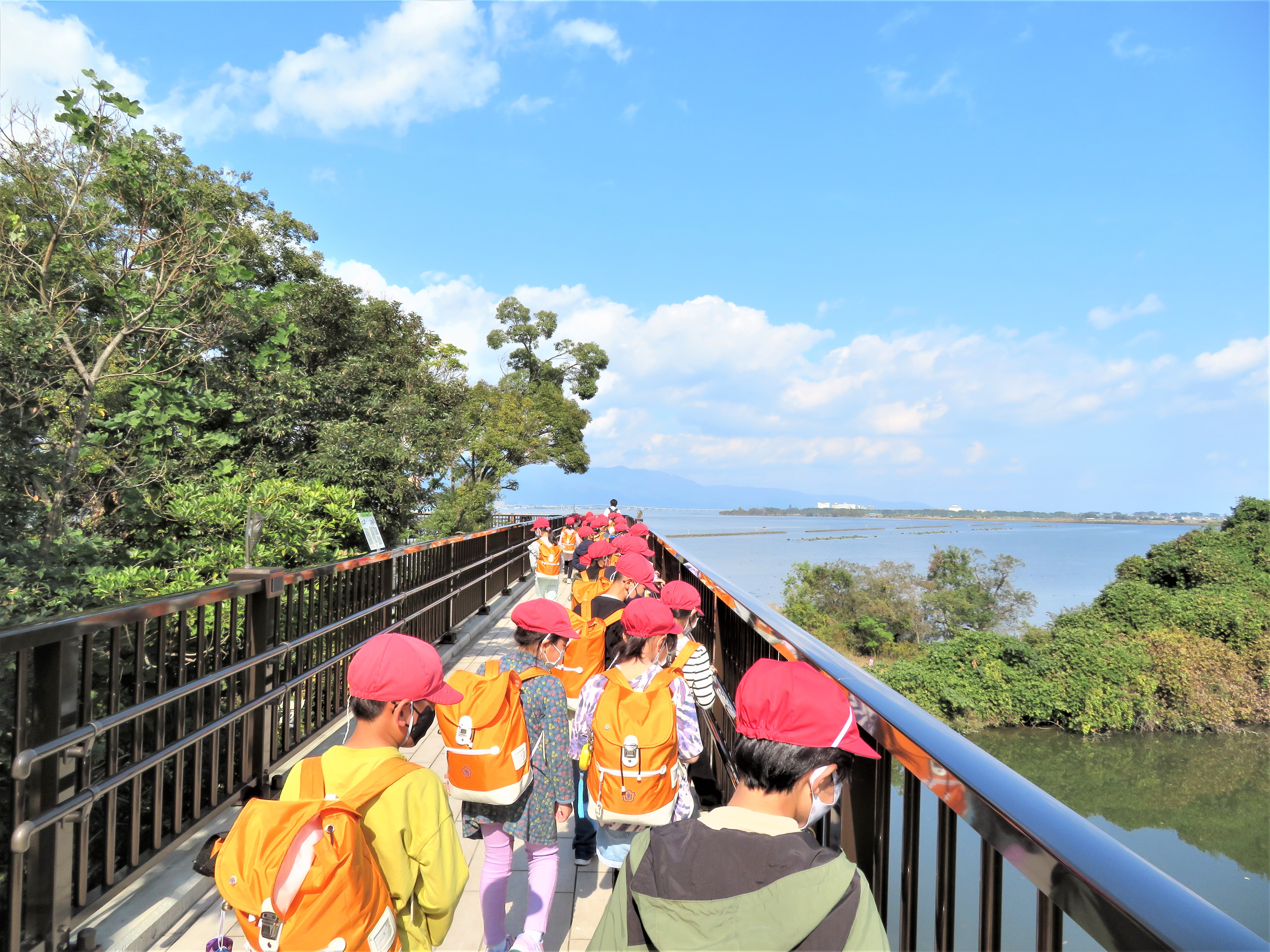 11月2日(火)に、3年生は校外学習として琵琶湖博物館に行きました。現地に到着後、3年生はすぐにお弁当タイムでした。良いお天気のもと、広々とした芝生広場でおいしいお弁当をいただきました。それから、琵琶湖博物館に入場しましたが、最初に、みんなで見学したのが新たに設置された樹冠トレイルです。高い木々の間を歩くことができる樹冠トレイルでは、木の上や木の実や鳥たちを見ることができました。途中で、美しいびわ湖や水鳥の見学もしました。