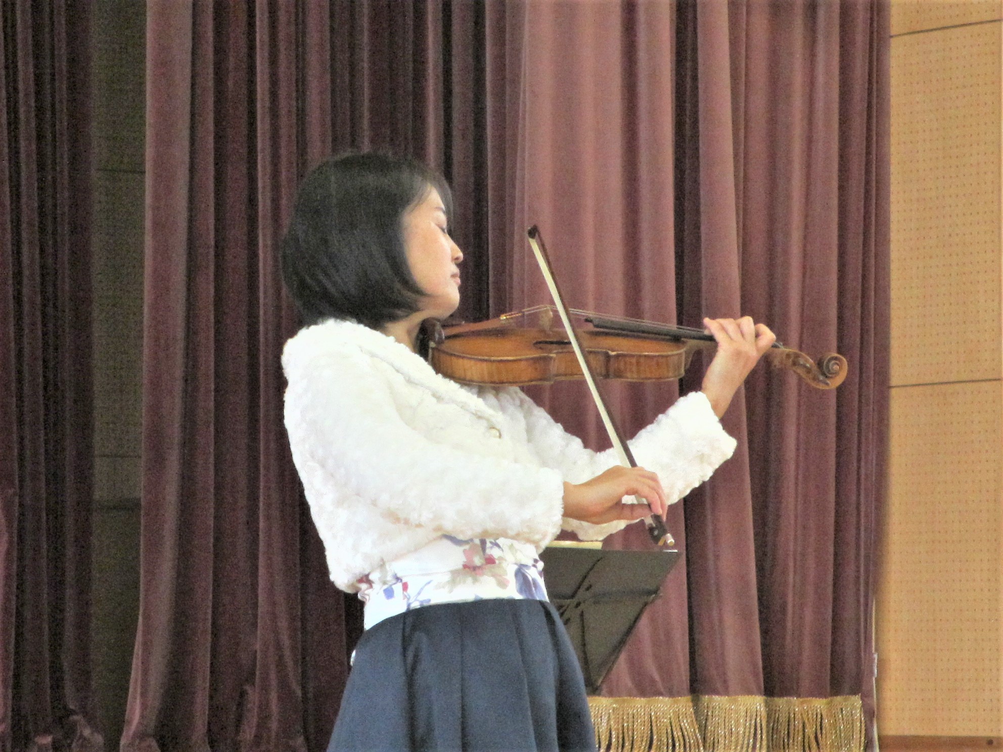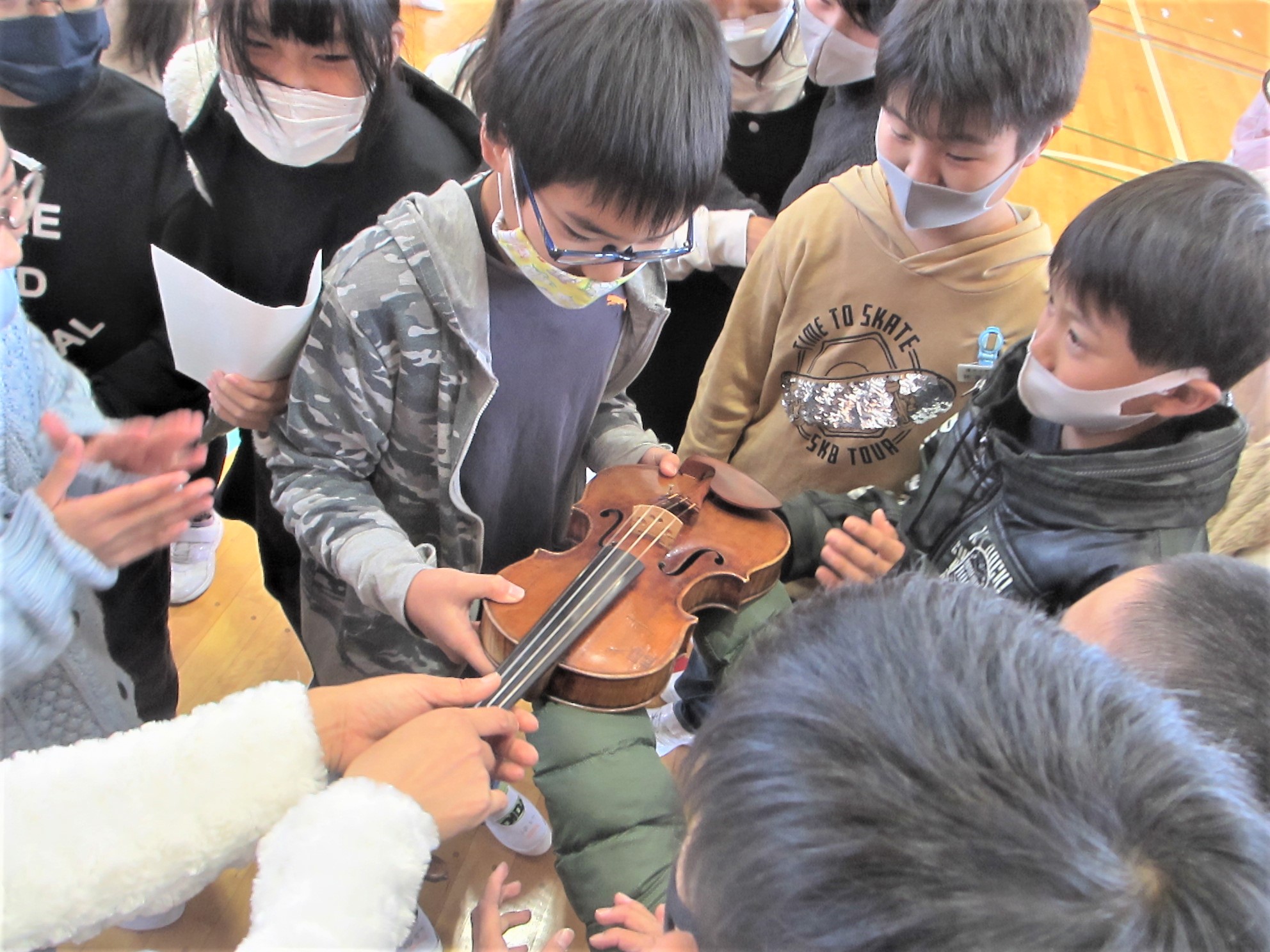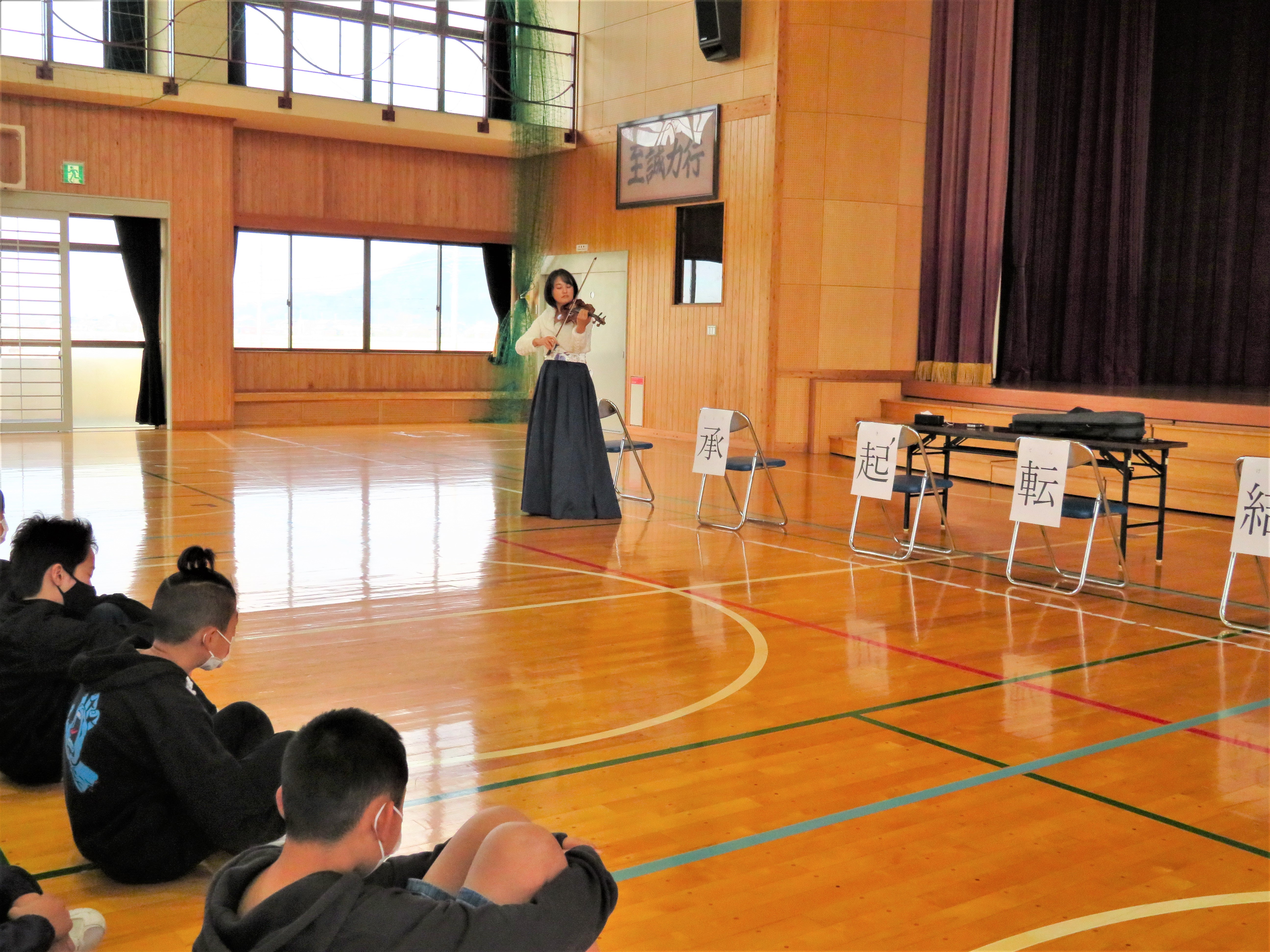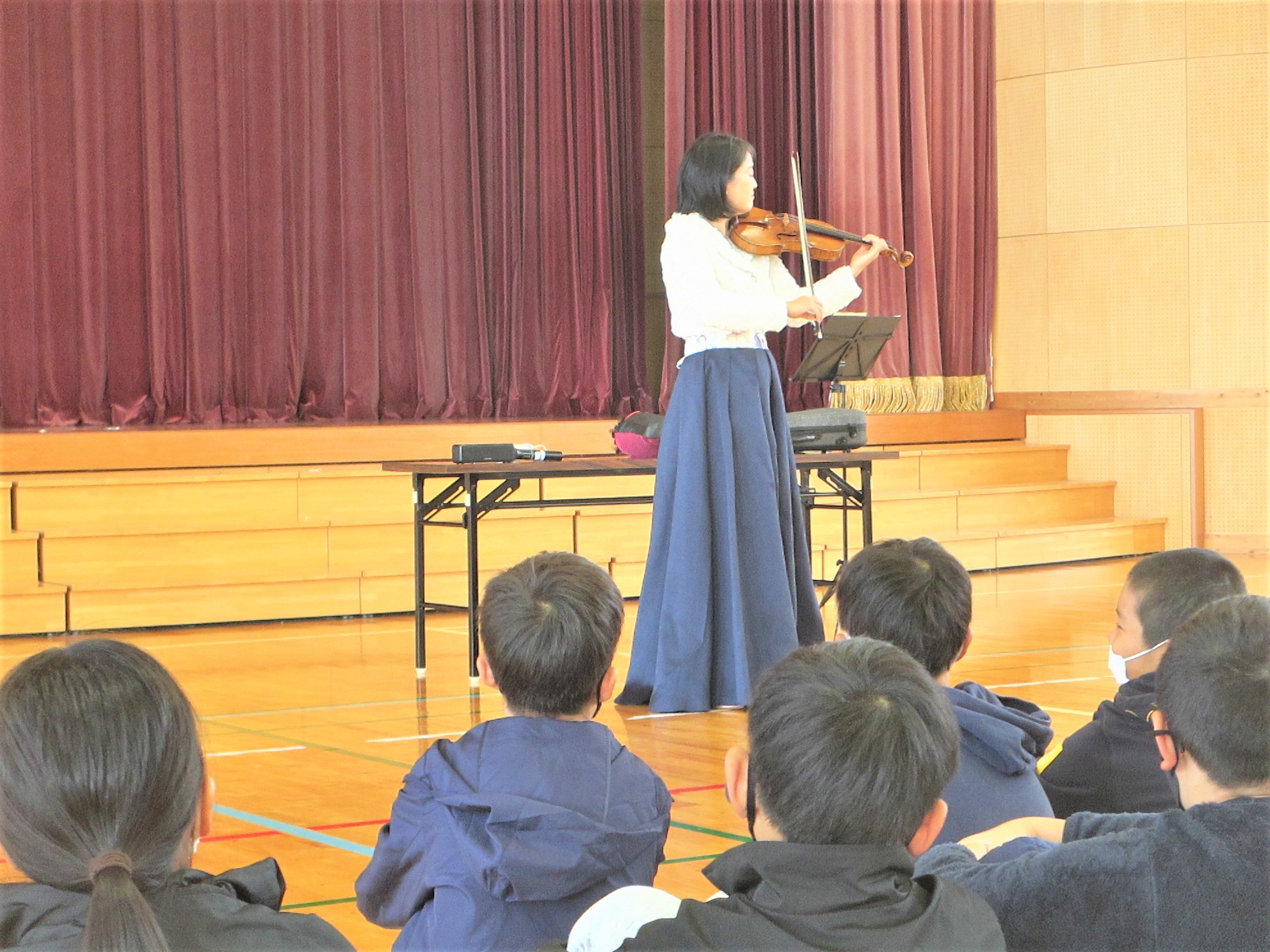 中川さんには、美しくのびやかなバイオリンの演奏をいただき、さらに、バイオリン上達のコツや練習で頑張った話を伺いました。子どもたちは、中川さんの「あきらめない心」や粘り強く練習する「心の強さ」に感銘を受けていました。また、中川さんは、これまでに何校もの子どもたちのために演奏をされていますが、そのお心に、人を喜ばせたい、幸せになってもらいたいという願いがあると語ってくださいました。中川さんのお心の尊さにみんなが感銘を受けていました。子どもたちの感想も感動いっぱいになっていることがわかりました。心癒され、励まされる素晴らしい時をいただきました。中川さん、本当にありがとうございました。
