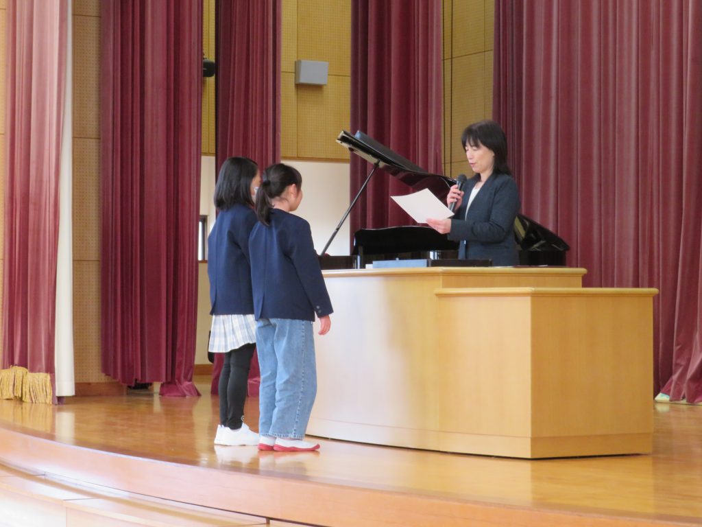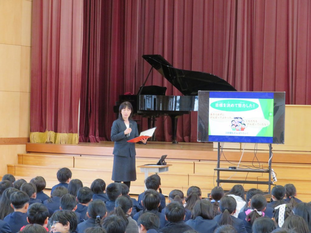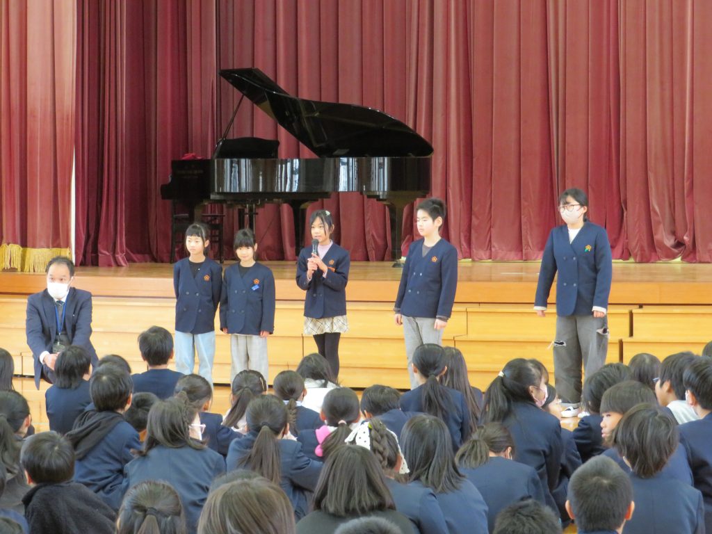 最後に、1,3,5年生の代表の友だちが、2学期がんばったこと、冬休みや3学期にがんばりたいことを発表しました。