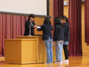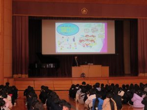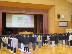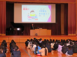 3学期の始業式を行いました。校長先生のお話の後、英語チャレンジや算数チャレンジ、年賀状展の表彰を行いました。