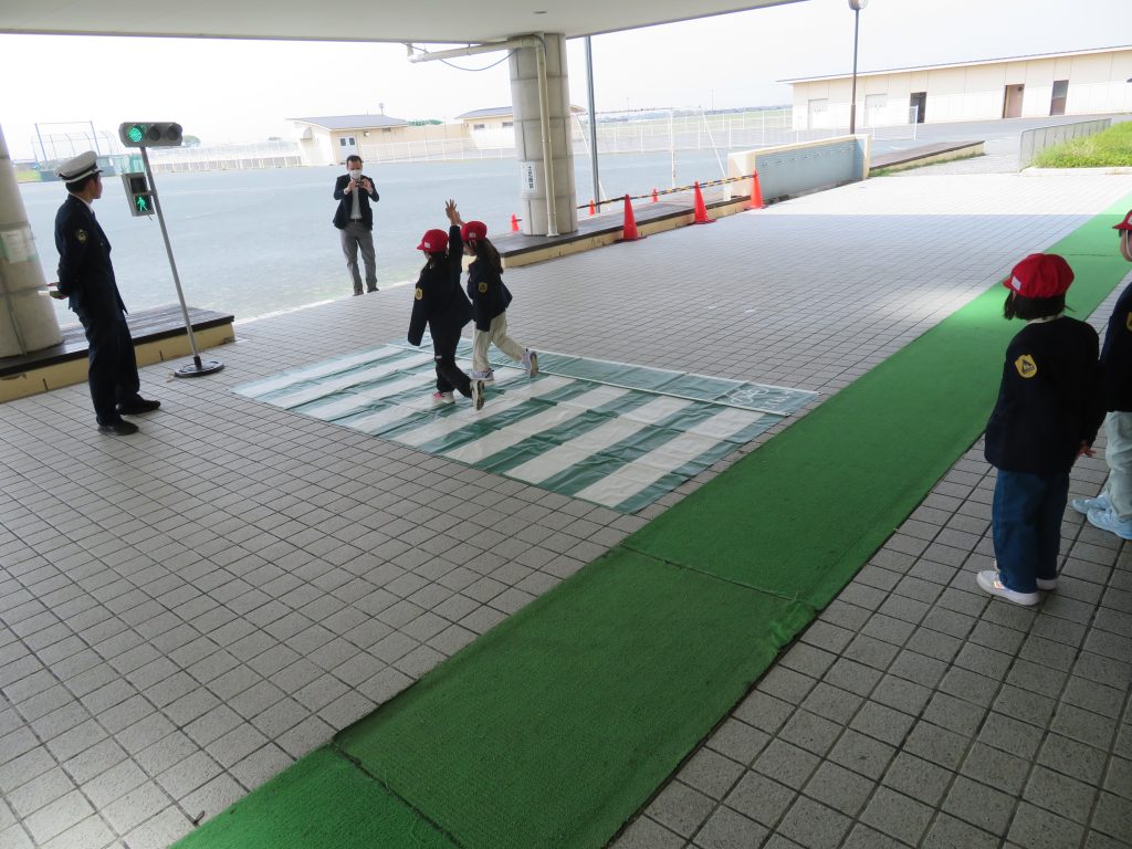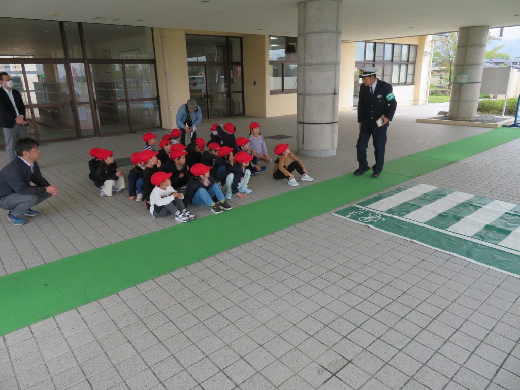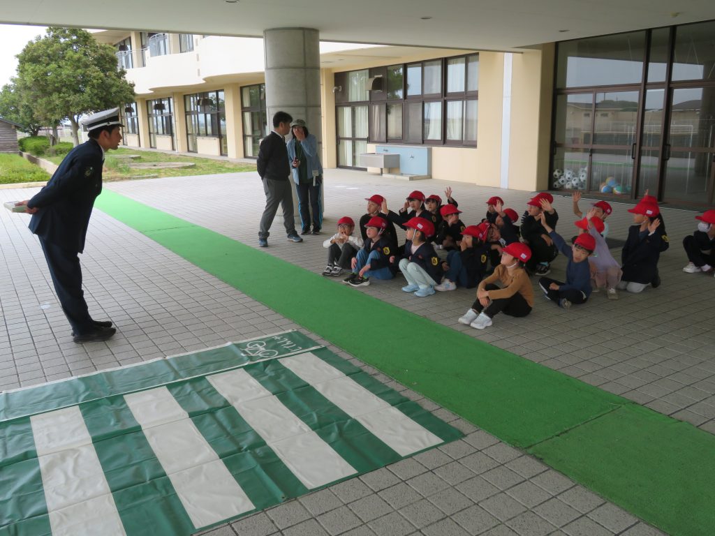 長浜警察署交通課の方にお越しいただき、交通安全教室を行いました。信号機のあるところとないところで、どうすればいいか自分で考えて歩道を渡ることができました。全員が、きちんとできたご褒美をいただきました。